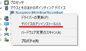 デバイスの更新で駄目だったので、一度「synaptics ps/2 port Touch Pad」をアンインストールし、再インストールをしてみます。