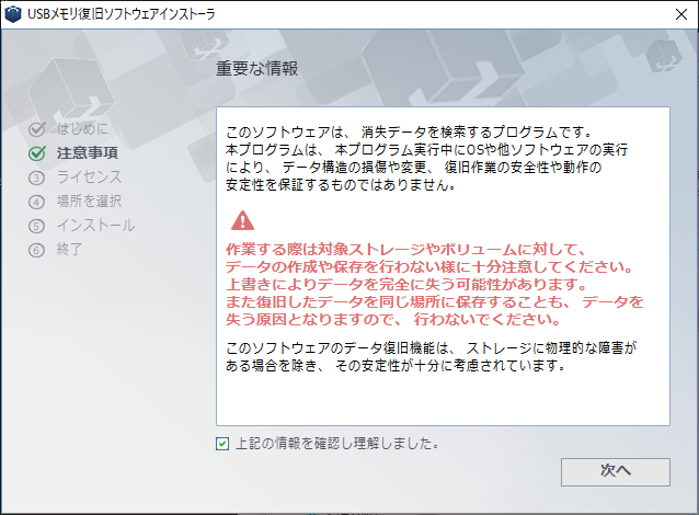 ソフトをDLしてからインストールします。注意事項等を確認し、左下のチェックボックスにチェックを入れて次へを押して完了です。